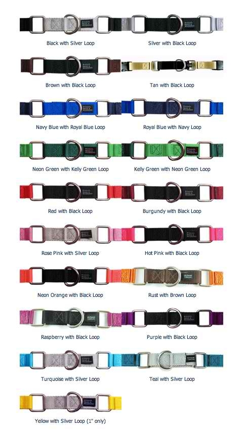 Each harness is a solid color with contrasting colored loop on the back of the harness.  Not only is the contrasting loop fashionable but also functional as you can easily identify how to place the harness on your dog, the loop sits on the back of the dog at the base of their neck.  When ordering either the 4-way training leash or the 10-configuration leash, you will receive a leash that matches the harness, unless you specify otherwise in the notes section when ordering.